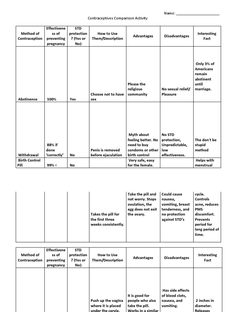 Name: _____________________ Contraceptives Comparison Activity | Birth Control | Combined Oral ...